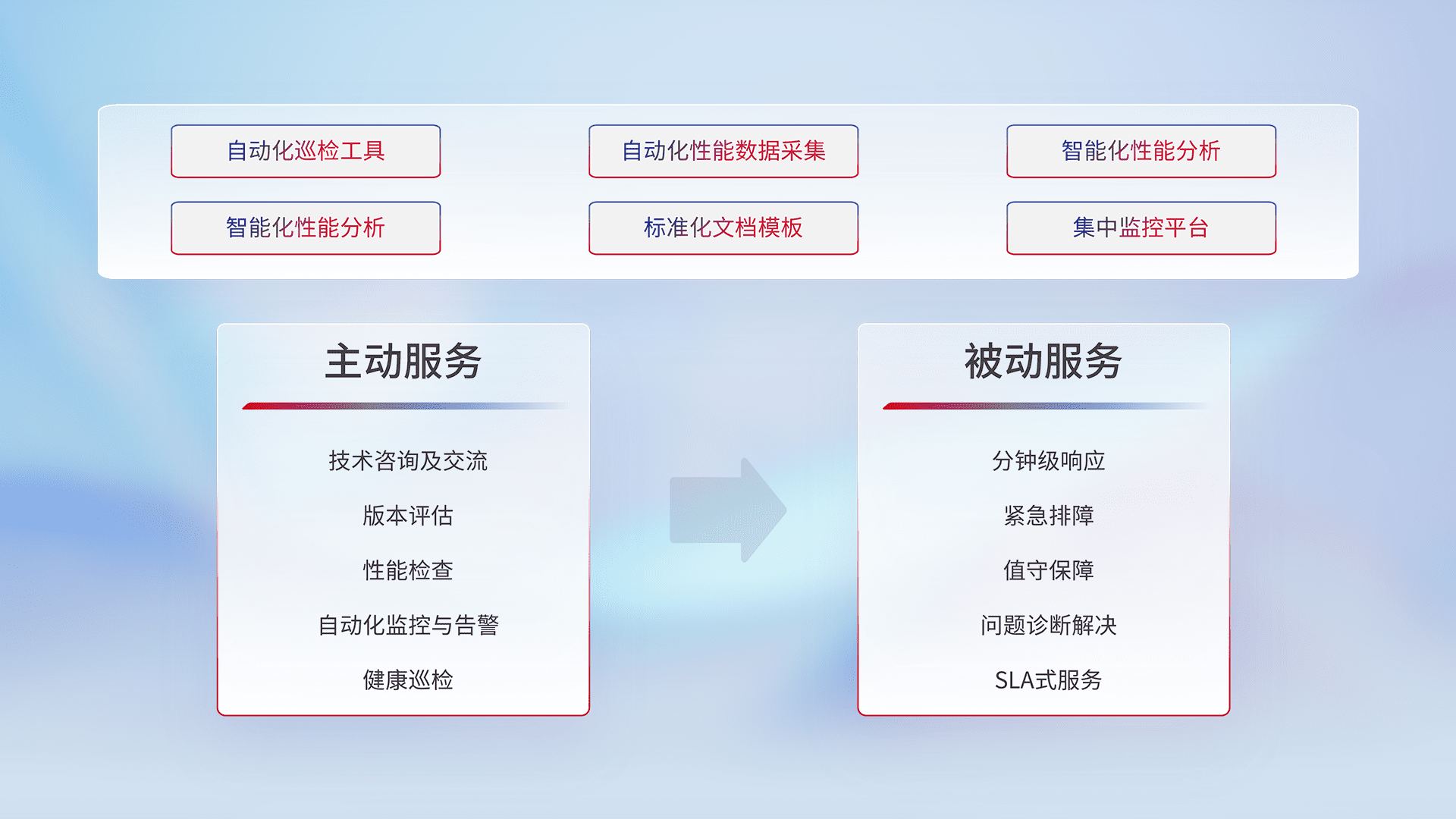 智能化工具和标准化文档,,,,保障服务质量,,,提供主动服务(包含技术咨询、、版本评估、、、性能检查、、、、自动化监控与告警、、、、健康巡检)和被动服务包含(分钟级响应、、、、紧急排障、、、值守保障、、、、问题诊断解决、、、、SLA服务)。。。。