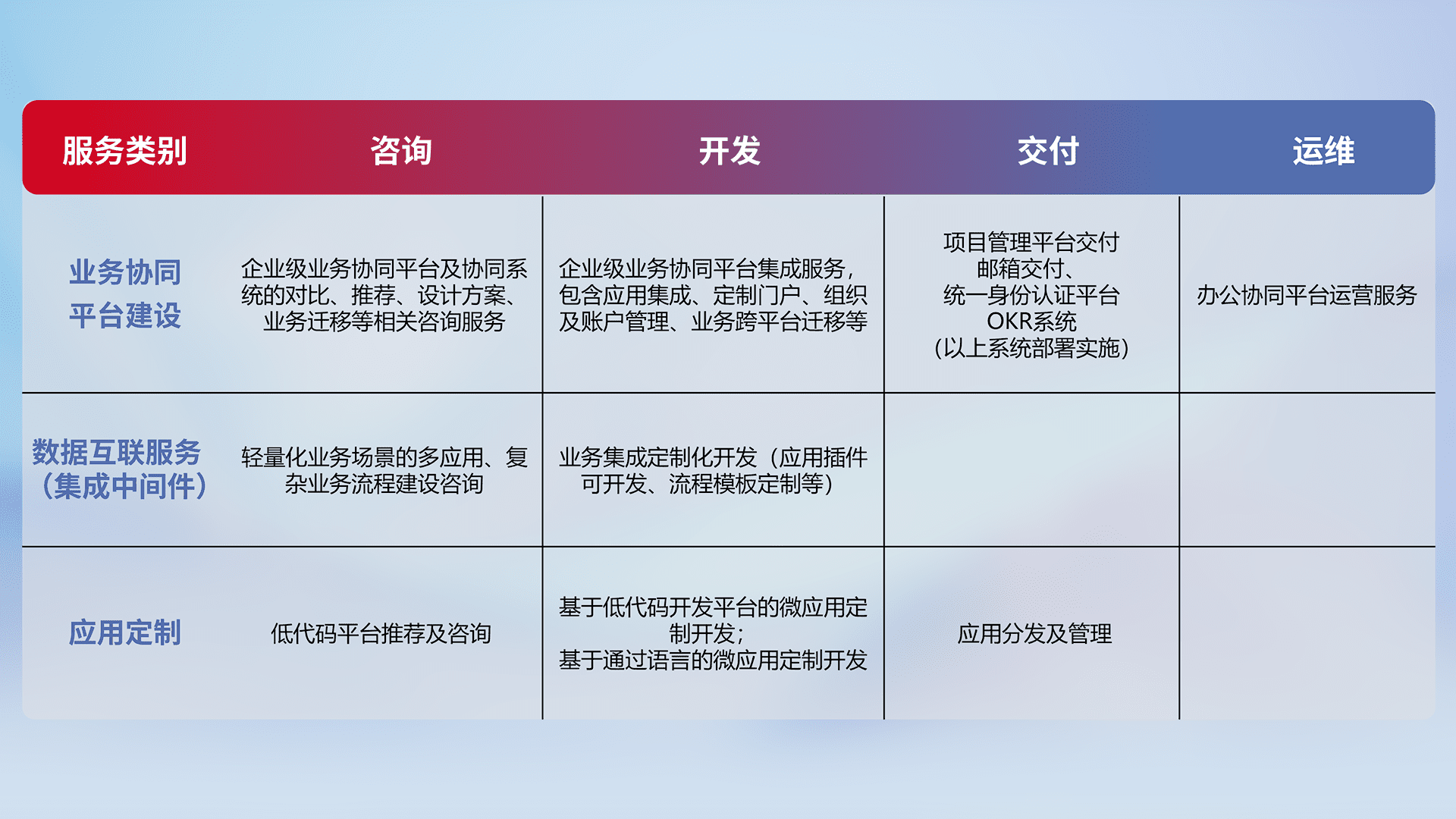 针对钉钉、、、企微、、、IDaas等平台级产品提供产品的规划、、、方案、、交付、、、、定制化开发等服务,,,实现如统一协同办公、、智能客户服务、、、、混合会议管理、、、、智能数据查询、、等业务场景,,,,实现数字化转型。。